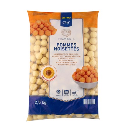 - Bramborové krokety Noisettes - předsmažené. Výrobek z brambor, hluboce zmrazený.