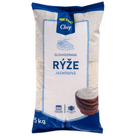 - Rýže dlouhozrnná, loupaná, jasmínová. Vyrobeno z rýže seté (Oryza sativa L.)