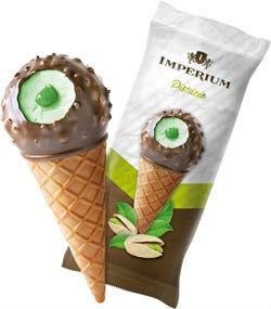 - Mražený krém s rostlinným tukem s pistáciovou příchutí a náplní s pistáciovou příchutí v oplatce s kakaovou polevou s arašídy.