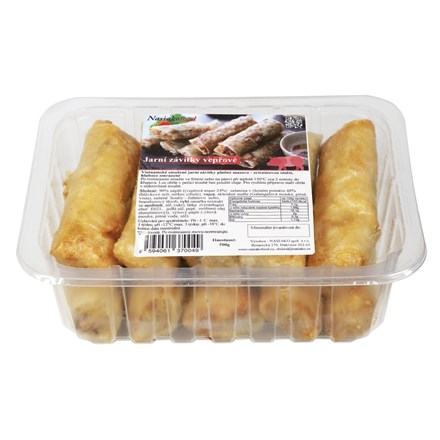 - Složení: 90% náplň ((vepřové maso 24%)zelenina v různém poměru 48% (hlávkové zelí, mrkev cibule), vejce, strouhanka (pšeničná mouka, droždí, pitná voda, jedlá sůl), skleněné nudle (arrowroot škrob, pitná voda), jidášovo ucho, bramborový škrob, rybí omáčka (extrakt ze sardinek, sůl, cukr), látka zvýrazňující chuť E621, jedlá sůl, pepř, olej řepkový)), rýžový papír (rýžová mouka, pitná voda, sůl).