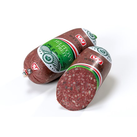 - vepř. maso (min. 34%), ječné kroupy, voda, v. krev, v. sádlo, v. kůže, jedlá sůl s jodem, koření (hořčice), extrakty koření, dextroza.