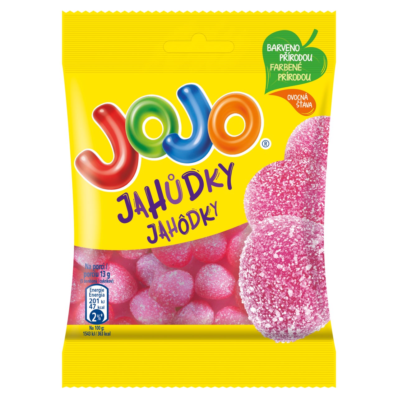 - Cukr, glukózový sirup, želírující látky (pektiny, arabská guma), kyselina (kyselina citronová), koncentrát šťávy z černé mrkve, aroma (jahoda). regulátor kyselosti (citronany sodné)