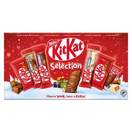 - V dárkovém balení najdete 2× tyčinku KitKat 4Finger, 1× tyčinku KitKat Chunky v mléčné čokoládě, 1× tyčinku KitKat Chunky Peanut Butter, 1× tyčinku KitKat Chunky v bílé polevě a 1× KitKat Mikuláše s kakaovou náplní.