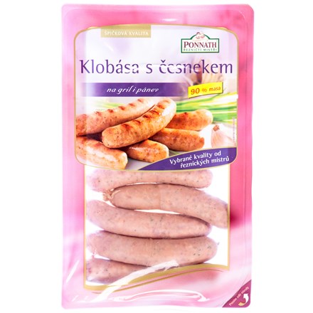- Vepřové maso 90%, pitná voda, jedlá sůl s jodem (jedlá sůl, jodičnan draselný), stabilizátor: difosforečnany, koření, antioxidant: erythorban sodný, kvasničný extrakt, aroma, petržel, česnek 0,4%, pažitka, extrakty koření, konzervant: dusitan sodný, skopové střevo