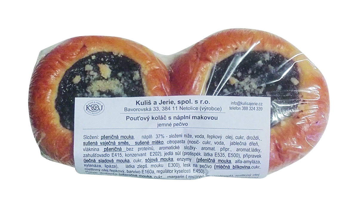 - pšeničná mouka, náplň 37% - složení níže, voda, řepkový olej, cukr, droždí, sušená vaječná směs, sušené mléko, citropasta (nosič- cukr, voda, jablečná dřeň, vláknina pšeničná bez proteinů, aromatické složky- aromat. přípr., aromat.látky, zahušťovadlo E415, konzervant E202), jedlá sůl (protispék. látka E535, E500), přípravek (ječná sladová mouka, cukr, sójová mouka, enzymy (pšeničná mouka, alfa-amyláza, xylanáza, lipáza), látka zlepš. mouku E300), lesk na pečivo (mléčná bílkovina,cukr, rostlinný olej řepkový, barvivo E160a, regulátor kyselosti E450). Náplň maková: Maková náplň 50% (mák modrý stabiliz.50%, cukr, zahušť: E1414, sušené mléko, zahušť.: E466, aroma:vanilin, látka zlepš.mouku E300), pitná voda, strouhanka /pšeničná mouka, pitná voda, řepkový olej, jedlá sůl (protispékací látka E535,E500), droždí, ječná sladová mouka, cukr, pekařský přípravek (ječná sladová mouka, cukr, sojová mouka, enzymy (pšeničná mouka, alfa-amyláza, xylanáza, lipáza), látka zlepšující mouku E300). drobenka (pšeničná mouka, cukr, margarin ( rostlinné tuky (palmové), rostlinný olej (řepkový), pitná voda, emulgátory (mono-a diglyceridy mastných kyselin a slunečnicový lecitin), jedlá sůl 0,25%, konzervant (kyselina sorbová), regulátor kyselosti E330).