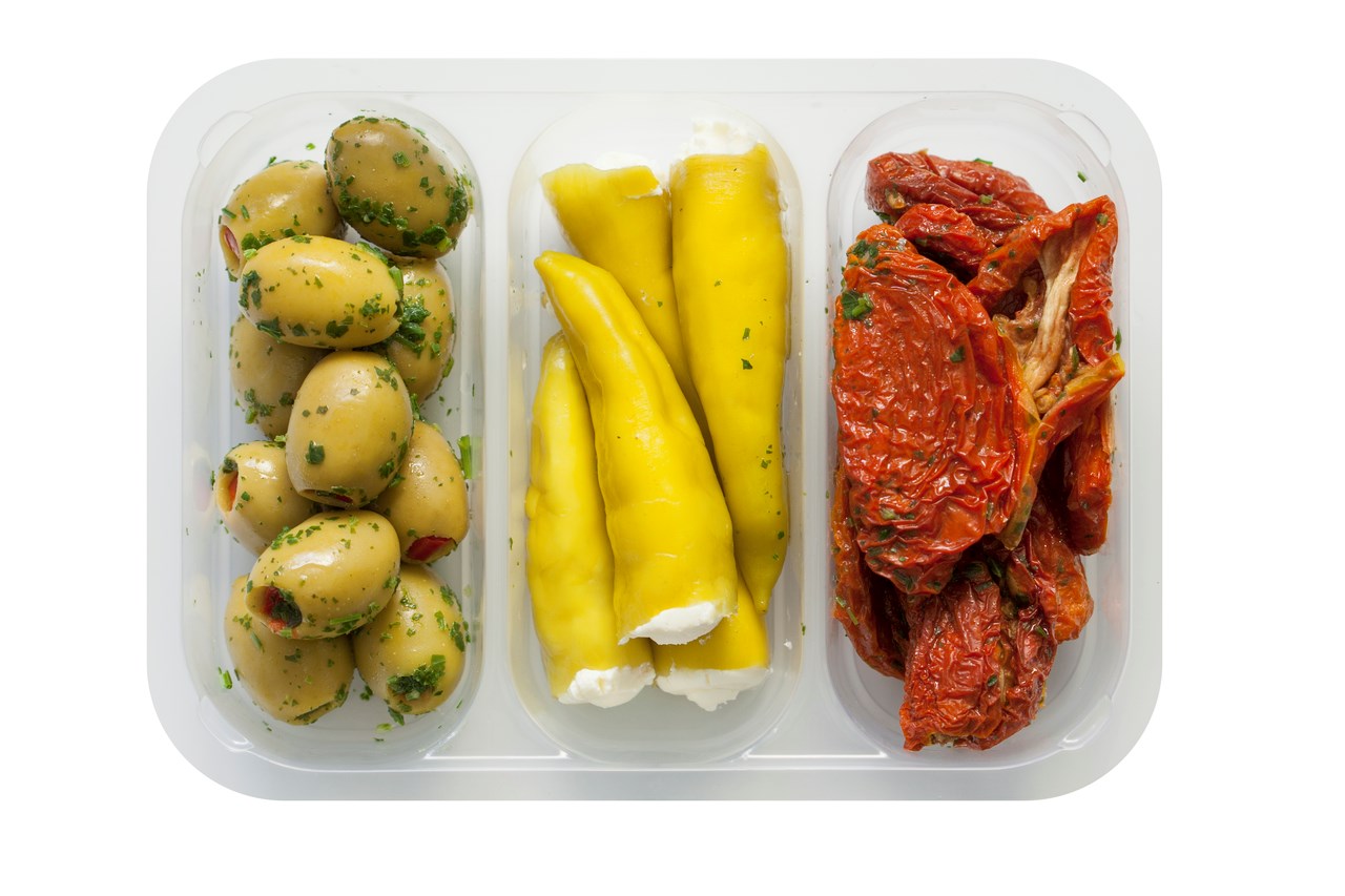 - směs zeleniny a oliv 68 % (zelené olivy bez pecky plněné paprikou, sušená rajčata, zelené feferonky, česnek), řepkový olej 16 %, SÝR 15 % (MLÉKO, SMETANA, tapiokový škrob, jedlá sůl, sýrařské kultury), jedlá sůl, vinný ocet (antioxidant: OXID SIŘIČITÝ), byliny, regulátory kyselosti: kyselina citronová, kyselina mléčná, konzervant: benzoan sodný, antioxidant: DISIŘIČITAN SODNÝ.