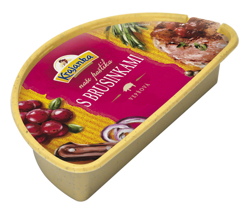 - Vepřová játra 30%, vepřové sádlo, vývar, voda, klikva velkoplodá 5%, brusnice brusinka 1%, jedlá sůl, cukr, škrob, dextróza, koření, glukózový sirup, rostlinné bílkoviny, aroma, zahušťovadlo E412, antioxidant E316, konzervant E250.