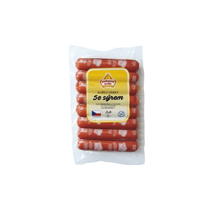 - Kuřecí maso strojně oddělené 60 %, pitná voda, sýr 7 % (MLÉKO), kuřecí kůže, bramborový škrob, jedlá sůl, stabilizátor trifosforečnany, antioxidant kyselina erythorbová, konzervant dusitan sodný, aroma, extrakty koření, kvasničný extrakt.