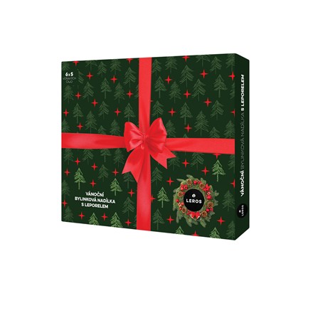 papírová kazeta s 30 čaji (6 druhů po 5 sáčcích) i otevření víka kazetdoplněné o vánoční leporelo, které se rozloží přy