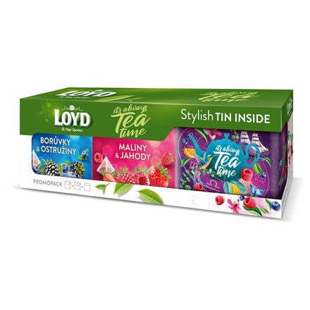 Loyd pyramida Maliny & jahody 20x2g - jablko, květ ibišku, plod maliny 10 %, aromata, kořen lékořice 5 %, plod jahody 1 %malinová šťáva v prášku 0,2 % (maltodextrin, koncentrovaná malinová šťáva 40 %). Loyd pyramida Borůvky & ostružiny 20x2g - květ ibišku, jablko, aromata, plod maliny, kořen lékořice 5 %, plod borůvky 1 %, Obsahuje lékořici – osoby trpící vysokým krevním tlakem plod ostružiny 1 %