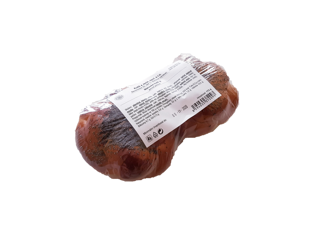 - PŠENIČNÁ mouka, pitná voda, cukr, řepkový olej, droždí, pekařský přípravek (JEČNÁ sladová mouka, cukr, SÓJOVÁ mouka, enzymy, látka zlepšující mouku E300), jedlá sůl (protispékací látka E535, E500), sušená VEJCE, lesk na pečivo (MLÉČNÁ bílkovina, cukr, rostlinný olej řepkový, barvivo E160a, kypřící látka: E450). Posyp: mák