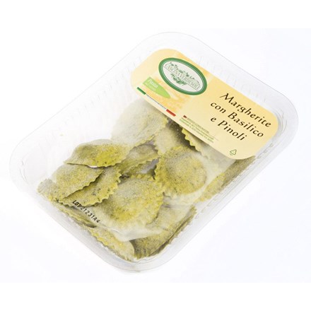 - Margherite s bazalkou a piniovými oříšky. Vaječné nesušené těstoviny se špenátem plněné náplní s bazalkou a piniovým oříšky