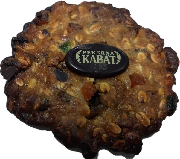 - Placička z ovesných vloček, vlašských ořechů, kandovaného ovoce a rozinek, potažená v čokoládové polevě