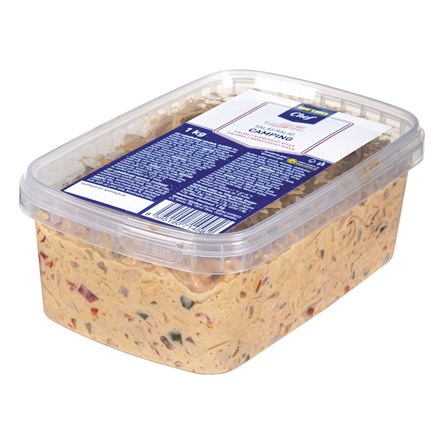- majonéza (řepkový olej, pitná voda, modifikovaný bramborový škrob, stabilizátory: guma guar, xanthan; jedlá sůl, sušené vaječné žloutky, ocet kvasný lihový, konzervant: benzoan sodný), lahůdkový salám 20% (vepřové maso 40%, pitná voda, vepřové kůže, bramborový škrob, jedlá sůl, konzervant: dusitan sodný; česnek, stabilizátor: trifosforečnany; koření, dextróza), marinovaná cibule (cibule, pitná voda, ocet kvasný lihový, jedlá sůl, cukr, antioxidant: disiřičitan draselný; konzervant: sorban draselný), pasterovaná zelenina (okurky, červená paprika, pitná voda, ocet kvasný lihový, cukr, jedlá sůl), kečup (pitná voda, rajský protlak, cukr, modifikovaný škrob, jedlá sůl, ocet kvasný lihový, kyselina: kyselina citronová; konzervant: sorban draselný), cukr, hořčice plnotučná (pitná voda, hořčičné semeno, ocet kvasný lihový, cukr, jedlá sůl, koření), konzervované feferony (feferony, pitná voda, ocet kvasný lihový, cukr, jedlá sůl, konzervant: sorban draselný), jedlá sůl, chilli, paprika červená mletá, konzervanty: benzoan sodný, sorban draselný