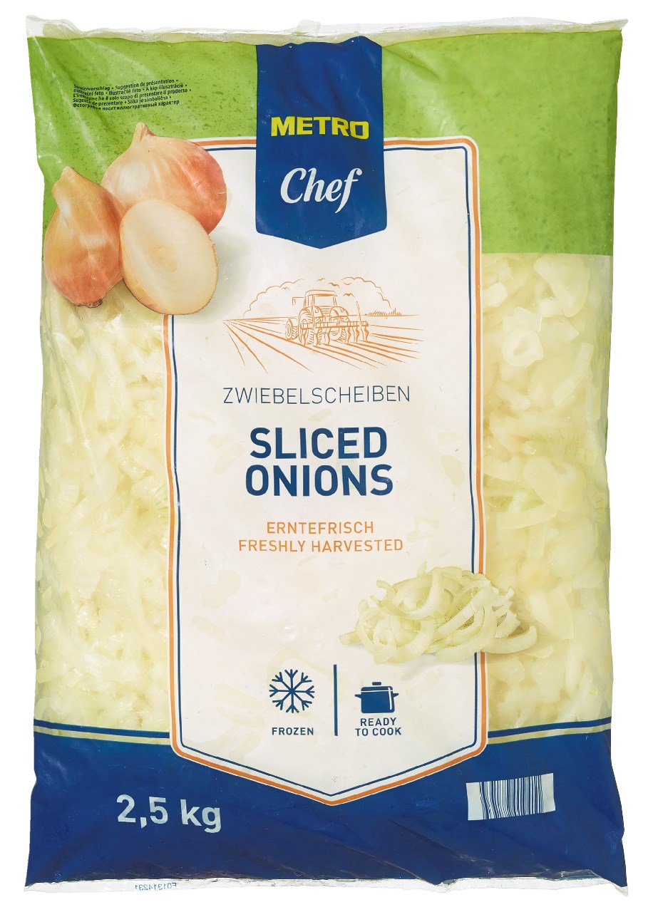 - Metro Chef onion slices. The onions are peeled, washed, cut in slices and individually quick-frozen shortly after harvesting. Quick-freezing guarantees an optimal conservation of taste, appearance and nutrients. The onions are ready-to-cook and do not contain any additives.
