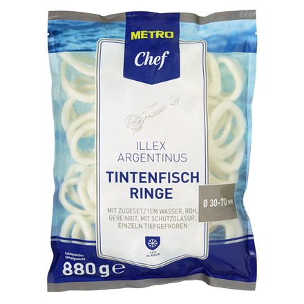 - Kalmar (Illex argentinus), syrový, očištěný, loupaný, krájený na rovnoměrné kroužky o průměru 3-7 cm. S přidanou vodou, glazurovaný, jednotlivě hluboce zmrazený.