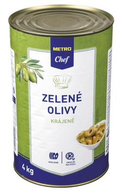 - Zelené olivy krájené ve slaném nálevu. Zpracované olivy. Pasterováno.