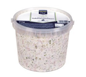- majonéza (řepkový olej, pitná voda, modifikovaný bramborový škrob, stabilizátory: guma guar, xanthan; jedlá sůl, sušené vaječné žloutky, ocet kvasný lihový, konzervant: benzoan sodný), lahůdkový salám 35% (vepřové maso 40%, pitná voda, vepřové kůže, bramborový škrob, jedlá sůl, konzervant: dusitan sodný; česnek, stabilizátor: trifosforečnany; koření, dextróza), pasterované okurky (okurky, pitná voda, ocet kvasný lihový, cukr, jedlá sůl), marinovaná cibule (cibule, pitná voda, ocet kvasný lihový, jedlá sůl, cukr, antioxidant: disiřičitan draselný; konzervant: sorban draselný), hrášek, cukr, jedlá sůl, konzervanty: benzoan sodný, sorban draselný; pepř černý, hořčice plnotučná (pitná voda, hořčičné semeno, ocet kvasný lihový, cukr, jedlá sůl, koření)