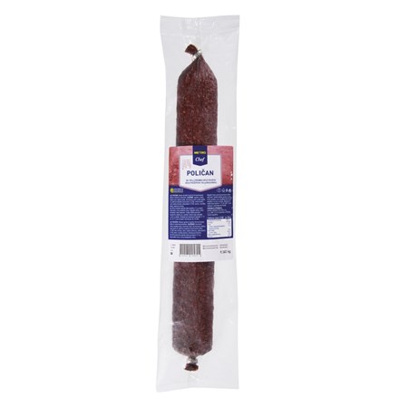 Vedle krájeného Poličanu máme i salám v celku tak, aby se dal porcovat dle vašeho přání. Český tradiční fermentovaný salám má široké využití ve studené kuchyni. Na 100 g výrobku bylo ve výrobě použito 145 g masa. Vyrobeno s certifikáty IFS Food a EKO-KOM.