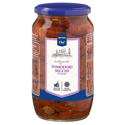 - Rehydratovaná sušená rajčata 48 %, slunečnicový olej 46 %, kapary, cukr, sůl, vinný ocet (obsahuje siřičitany), bylinky, antioxidant (kyselina askorbová), regulátor kyselosti (kyselina citronová a kyselina mléčná).