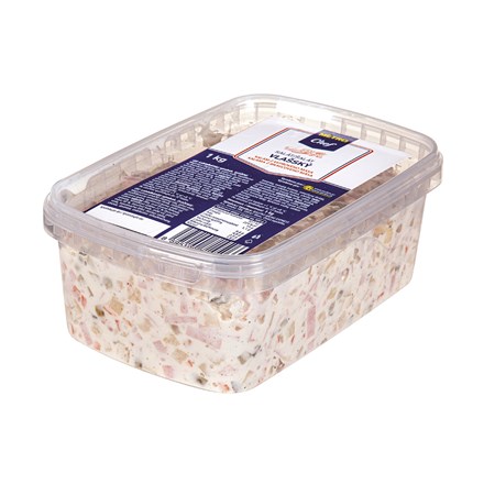- majonéza (řepkový olej, pitná voda, modifikovaný bramborový škrob, stabilizátory: guma guar, xanthan; jedlá sůl, sušené vaječné žloutky, ocet kvasný lihový, konzervant: benzoan sodný), brambory, lahůdkový salám 22% (vepřové maso 40%, pitná voda, vepřové kůže, bramborový škrob, jedlá sůl, konzervant: dusitan sodný; česnek, stabilizátor: trifosforečnany; koření, dextróza), konzervovaná zelenina (mrkev, celer, pitná voda, ocet kvasný lihový, jedlá sůl, cukr, antioxidant: disiřičitan draselný; konzervant: sorban draselný), pasterované okurky (okurky, pitná voda, ocet kvasný lihový, cukr, jedlá sůl), cukr, hrášek, hořčice plnotučná (pitná voda, hořčičné semeno, ocet kvasný lihový, cukr, jedlá sůl, koření), jedlá sůl, konzervanty: benzoan sodný, sorban draselný; pepř černý mletý