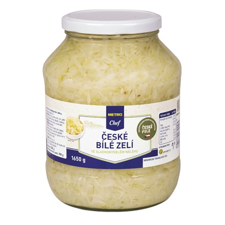 - bílé zelí, pitná voda, cukr, jedlá sůl, ocet kvasný lihový, přírodní aromata, HOŘČIČNÉ SEMÍNKO, kmín, antioxidant: DISIŘIČITAN DRASELNÝ.