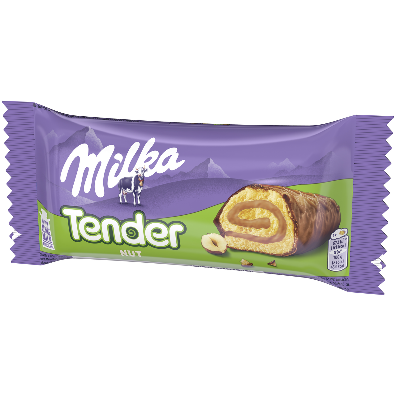 - Roláda plněná lískooříškovou náplní (23 %) a máčená v mléčné čokoládě z alpského mléka (28 %).