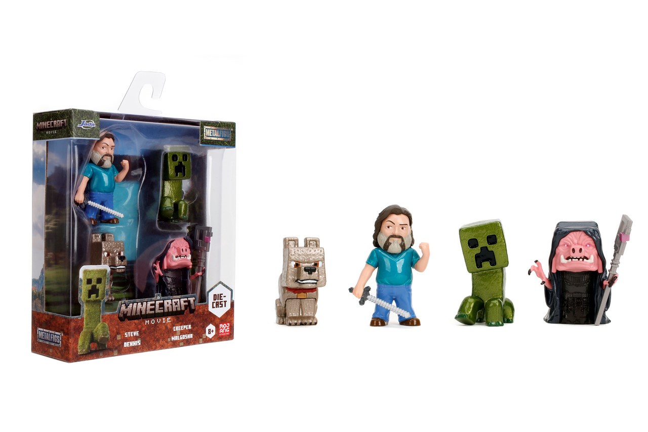 - Sada 4 kovových figurek Minecraft Movie o velikosti cca 6,5 cm. Postavy: Steve, Wolf, Creeper, Malgosha.