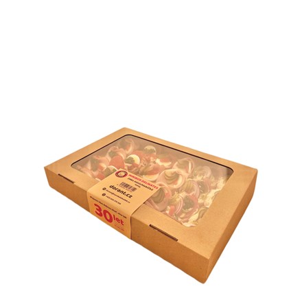 - Obsahuje: minichlebíček s roastbeefem, s mortadelou, s karé, s jalapeňos, s anglickou slaninou, s debrecínkou.Složení: bageta světlá (pšeničná mouka hladká, voda, rostlinný olej, droždí, sůl, cukr, látka zlepšující mouku favorit S), tatarská omáčka (majonéza (řepkový olej, pitná voda, zahušťující směs /modifik. bramb. škrob/, stabilizátor /guma guar, xantan, karubin/, vaječné žloutky /vaj.žloutky, sůl, maltodextrin/, kvasný ocet, hořčice /voda, hořčičné semeno, ocet, sůl, koření/, cukr, sůl, stabilizátory /guma guar, xantan/, konzervant sorban draselný), okurky sterilované (okurky, pitná voda, ocet, cukr, sůl, extrakt koření), cibule steril./cibule řezaná, ocet, cukr, sůl, výtažky koření, antioxidanty E330, E224/, okurková voda), vajíčková pomazánka (vejce vařená, majonéza (řepkový olej, pitná voda, zahušťující směs /modifik. bramb. škrob/, stabilizátor /guma guar, xantan, karubin/, vaječné žloutky /vaj.žloutky, sůl, maltodextrin/, kvasný ocet, hořčice /voda, hořčičné semeno, ocet, sůl, koření/, cukr, sůl, stabilizátory /guma guar, xantan/, konzervant sorban draselný), hořčice (voda, hořčič. semeno, ocet, cukr, sůl, koření, konzervant E211, barvivo E102, E110), cibule čerstvá, sůl, pažitka sušená, barvivo tartrazin E102), francouzský dresing (řepkový olej, pitná voda, cukr, ocet kvasný lihový, rajčatový protlak, vejce, semínko hořčice, jedlá sůl, modifikovaný škrob, koření, cibulové aroma, stabilizátory-guarová guma a xantan, konzervant sorban draselný, byliny, barvivo betakaroten/, majonéza /pitná voda, řepkový olej, zahušťovadlo: modifikovaný škrob, kvasný ocet lihový, vaječný žloutek, jedlá sůl, cukr, stabilizátory: karubin, xantan, regulátor kyselosti: diacetát sodný hydrogenuhličitan sodný, konzervant: sorban draselný/, kečup (pitná voda, rajčatový protlak, cukr, modifikovaný škrob E1422, jedlá sůl, ocet kvasný, kořenící přípravek/dextróza,paprika, cibule, rostl, olej, extrakty koření, aroma/, kys.citrónová, konzervant sorban draselný/, hořčice /voda, hořčičné semínko, ocet, cukr, sůl, extrakty koření, kurkuma/),