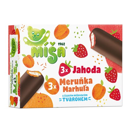 - Meruňka: voda, TVAROH (22 %), cukr, kakaová poleva (15 %) [kokosový olej, cukr, kakao se sníženým obsahem tuku (14 %), sušená SYROVÁTKA, emulgátor (SÓJOVÝ lecitin), aroma], meruňková dřeň (10 %), SMETANA, sušené odtučněné MLÉKO, glukózový sirup, stabilizátory (karubin, guma guar), regulátor kyselosti (kyselina citronová), emulgátor (mono- a diglyceridy mastných kyselin), barvivo (karoteny), aroma. Může obsahovat lískové ořechy. Bez lepku. Tvaroh z ČR. Jahoda: voda, TVAROH (22 %), jahodová dřeň (18 %), kakaová poleva (15 %) [kokosový tuk, cukr, kakao se sníženým obsahem tuku (14 %), sušená SYROVÁTKA, emulgátor (SÓJOVÝ lecitin), aroma], cukr, SMETANA, sušené odtučněné MLÉKO, regulátor kyselosti (kyselina citronová), glukózový sirup, kokosový tuk, stabilizátory (karubin, guma guar), emulgátor (mono- a diglyceridy mastných kyselin), přírodní aroma. Může obsahovat lískové ořechy. Bez lepku. Tvaroh z ČR.