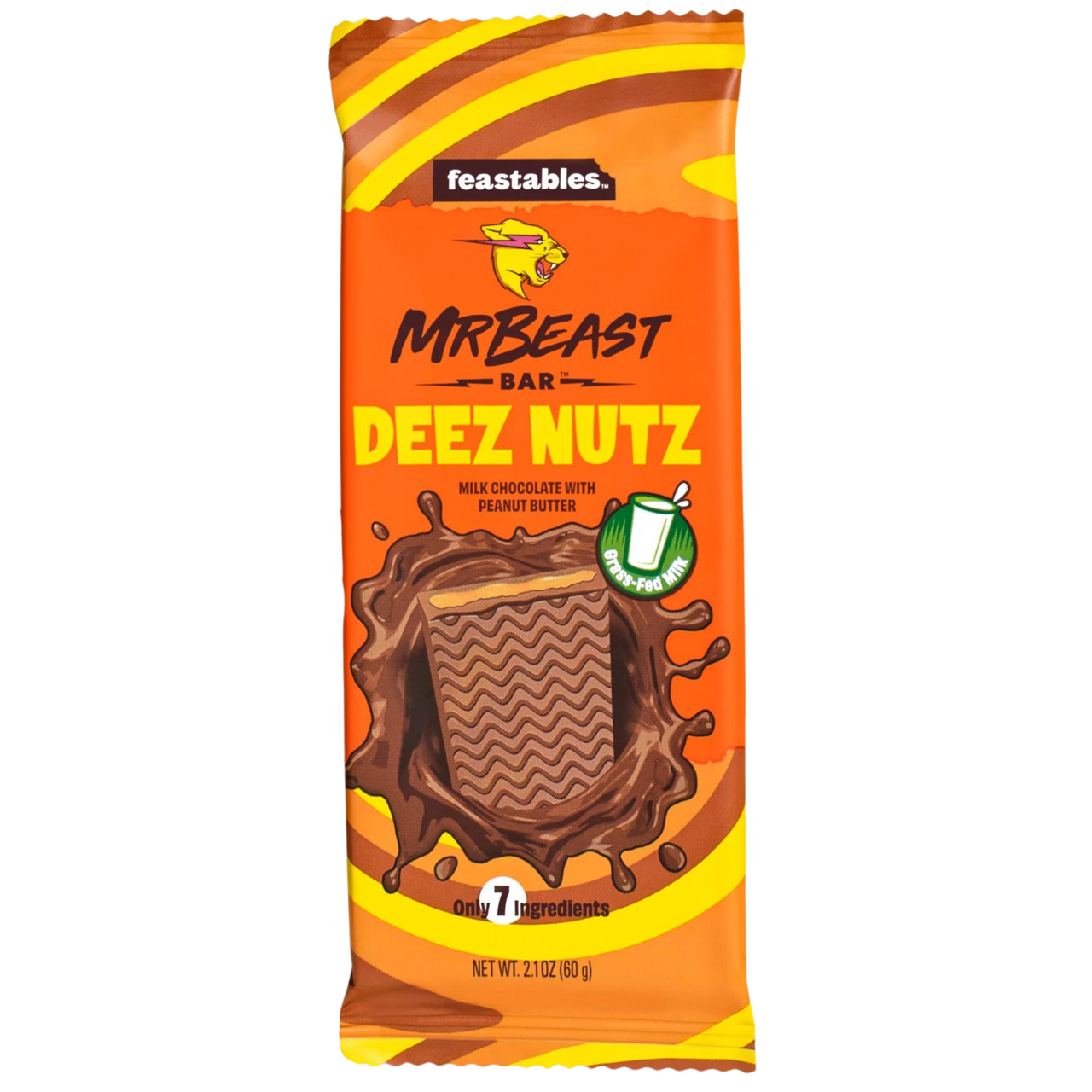 - Feastables MrBeast Deez Nuts mléčná čokoláda s náplní z arašídového másla 60 g - Všichni určitě znáte MrBeasta a jeho značku Feastables a proto je třeba si vychutnat tuhle čokoládu Deez Nuts s náplní z arašídového másla s poctivým složením. Okuste jak doopravdy chutná mít přes 237 miliónů odběratelů pomocí této čokolády.