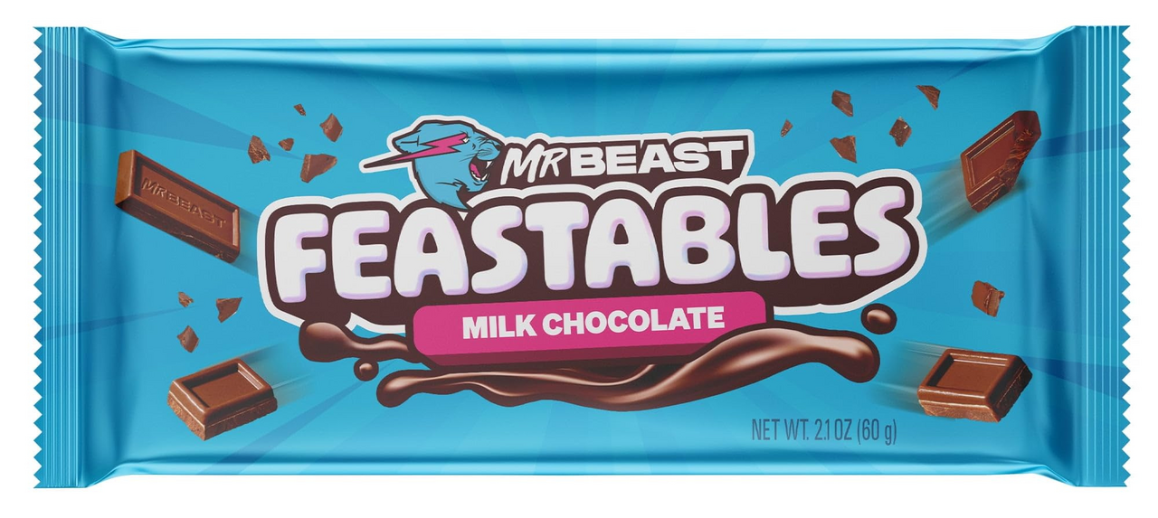- Feastables MrBeast mléčná čokoláda 60 g - Všichni určitě znáte MrBeasta a jeho značku Feastables a proto je třeba si vychutnat tuhle mléčnou čokoládu s poctivým složením. Okuste jak doopravdy chutná mít přes 237 miliónů odběratelů pomocí této čokolády.