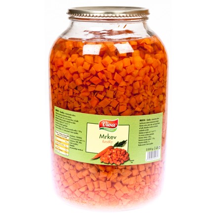 - Mrkev - kostky ve slanokyselém nálevu. Sterilovaná zelenina jednodruhová dělená.