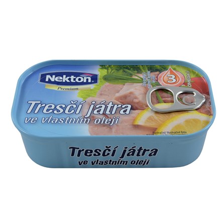 - Tresčí játra - treska obecná (Gadus morhua), vlastní olej, jedlá sůl. Hmotnost jater před zpracováním: 115 g. Úbytek hmotnosti v důsledku sterilace.