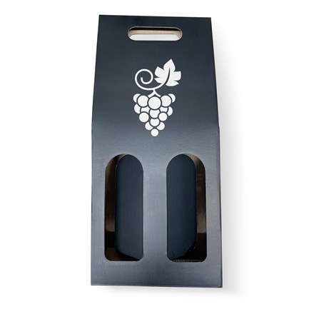 - Kašírovaná lakovaná odnosná krabice na 2 láhve s obloukovými otvory a uchem pro uchopení