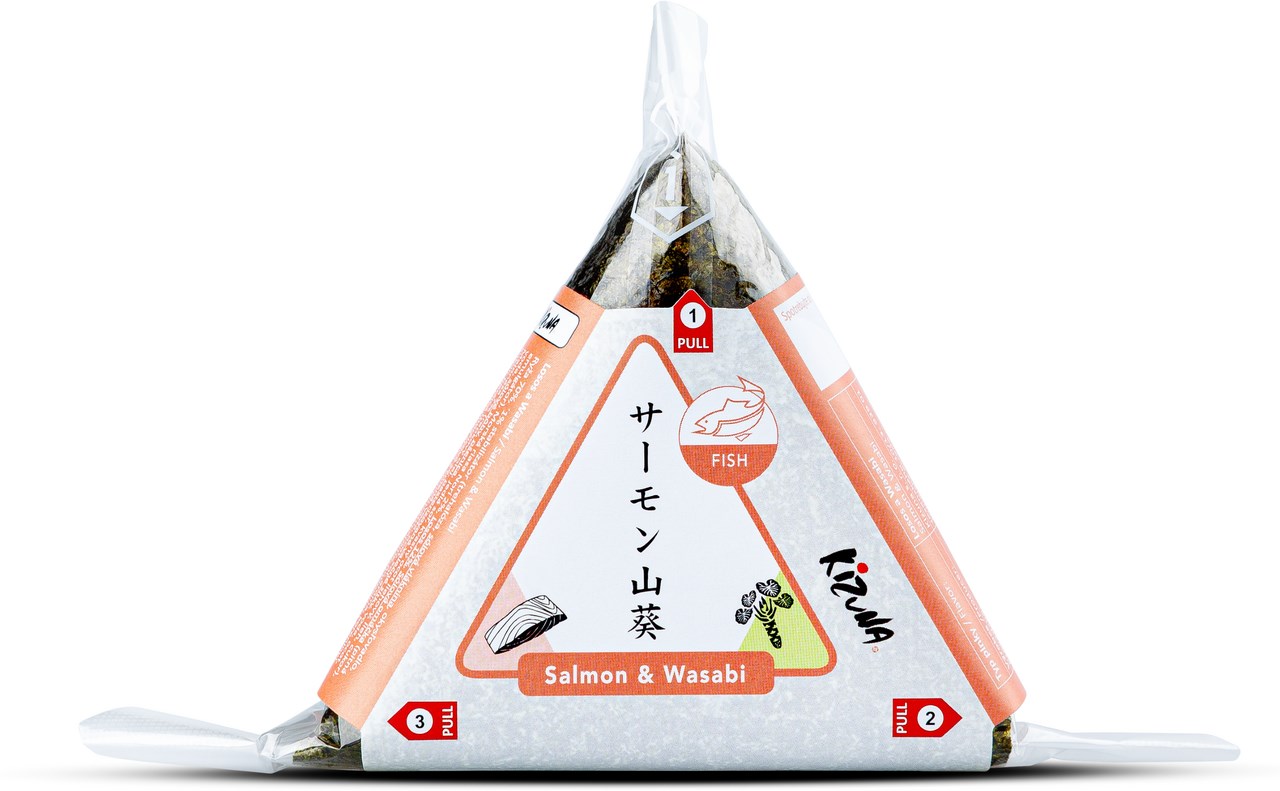 - 80% ochutená ryža (voda, ryža, vínny ocot liehový, cukor, soľ, ryžový ocot, melasa z trstinového cukru), 10% varený losos/Salmo salar, 8% majonéza [repkový olej, voda, vaječný žĺtok, horčica (voda, horčičné semienka, vínny ocot liehový, cukor, soľ, koreniny), vínny ocot liehový, cukor, zahusťovadlo: modifikovaný škrob; soľ, stabilizátory: guarová guma, taraková guma, xantán; regulátor kyslosti: kyselina citrónová; konzervačná látka: sorbát draselný], chrenový prášok (chren, horčičné semienka, cukor, farbivá: brilantná modrá FCF; antioxidant: kyselina askorbová), nori riasy (Pyropia yezoensis).