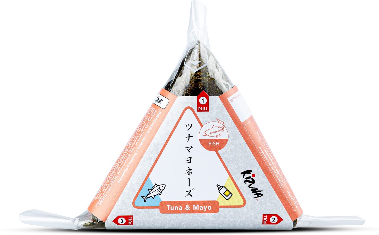 - 80% ochutená ryža (voda, ryža, vínny ocot liehový, cukor, soľ, ryžový ocot, melasa z trstinového cukru), 10% varený tuniak (tuniak/Katsuwonus pelamis, voda, soľ), 8% majonéza (repkový olej, voda, vaječný žĺtok, horčica [voda, horčičné semienka, vínny ocot liehový, cukor, soľ, koreniny], vínny ocot liehový, cukor, zahusťovadlo: modifikovaný škrob; soľ, stabilizátory: guarová guma, taraková guma, xantánová guma; regulátor kyslosti: kyselina citrónová; konzervačná látka: sorbát draselný), nori riasy (Pyropia yezoensis).