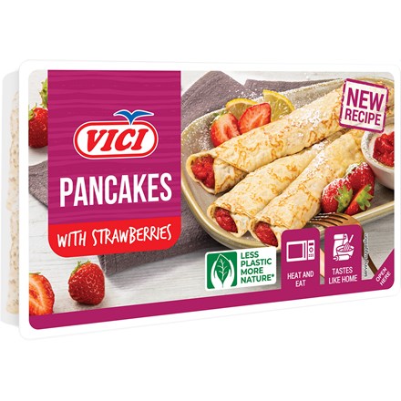 - Palačinka (71,4%): pitná voda, pšeničná mouka, vejce, slunečnicový olej, vaječný bílek, odstředěný mléčný prášek, jedlá sůl, prášek na pečení (kypřící prostředek E450(iii), regulátor kyselosti E500(ii), kukuřičný škrob).Jahodová náplň (28,6%): jahody (50%), cukr, pitná voda, upravený škrob, regulátor kyselosti: E330, E331, E333; zahušťovadlo E418, barvivo E120, aroma, konzervant E202.