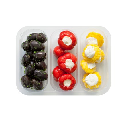 - směs zeleniny a oliv 68 % (černé olivy bez pecky, dýně, paprika), SÝR 19 % (MLÉKO, SMETANA, tapiokový škrob, jedlá sůl, sýrařské kultury), řepkový olej 12 %, jedlá sůl, regulátory kyselosti: kyselina citronová, kyselina octová, kyselina mléčná, antioxidant: kyselina askorbová, konzervanty: sorban draselný, benzoan sodný, zpevňující látka: chlorid vápenatý, stabilizátor: glukonan železnatý.