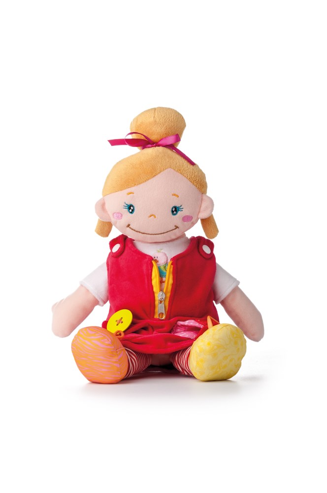 - Cílí na rozvoj jemné motoriky. Šatičky lze svlékat, na nožkách je suchý zip a tkaničky pro opakovaný trénink. Na kapse vestičky je veliký dřevěný knoflík pro trénink zapínání.| Výška výrobku: 41 cm | Věk: 3+