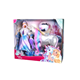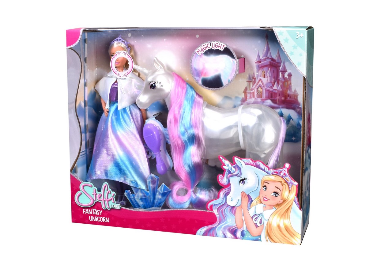 - Panenka Stefii v kouzelných šatech jako princezna s jednorožcem, který svítí a má dlouhou hřívu na česání. Výška panenky 29 cm.