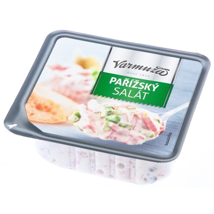 - lahůdkový salám [vepřové maso 76%, pitná voda, jedlá sůl s jodem (jedlá sůl, jodičnan draselný), hovězí maso, koření, česnek, stabilizátor: difosforečnany, vepřová bílkovina, konzervant: dusitan sodný, dextróza, maltodextrin, cukr], majonéza (řepkový olej, pitná voda, cukr, pasterovaný vaječný žloutek, ocet kvasný lihový, jedlá sůl, konzervant: benzoan sodný), sterilované okurky (okurky, ocet kvasný lihový, cukr, jedlá sůl, koření), vařený hrách, marinovaná cibule (cibule, ocet kvasný lihový, jedlá sůl), hořčice (pitná voda, hořčičné semeno, ocet kvasný lihový, cukr, jedlá sůl, koření), koření