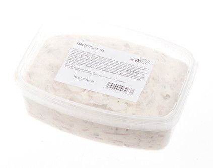 - lahůdkový salám [vepřové maso 76%, pitná voda, jedlá sůl s jodem (jedlá sůl, jodičnan draselný), hovězí maso, koření, česnek, stabilizátor: difosforečnany, vepřová bílkovina, konzervant: dusitan sodný, dextróza, maltodextrin, cukr], majonéza (řepkový olej, pitná voda, cukr, pasterovaný vaječný žloutek, ocet kvasný lihový, jedlá sůl, konzervant: benzoan sodný), sterilované okurky (okurky, ocet kvasný lihový, cukr, jedlá sůl, koření), vařený hrách, marinovaná cibule (cibule, ocet kvasný lihový, jedlá sůl), hořčice (pitná voda, hořčičné semeno, ocet kvasný lihový, cukr, jedlá sůl, koření), koření