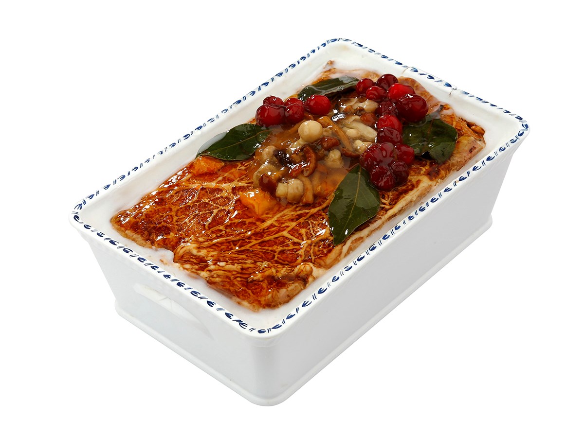 - vepřové sádlo, vepřová játra 18%, vepřové maso 18%, pitná voda, MLÉKO, brusinkový kompot 7,5%, (brusinky 66%, cukr), brusinky 5%, cukr, jodizovaná sůl, čekanková vláknina, PŠENIČNÝ škrob, MLÉČNÁ bílkovina, dextróza, koření (obsahuje HOŘČICI), přírodní aroma, cibulový prášek, bylinky, rajčatový protlak, vanilkový cukr (cukr, přírodní vanilkové aroma), třtinový cukr, jedlá sůl, antioxianty: E300, E325, E330, E331, E334, E392, stabilizátory: E450, E451, konzervanty: E250, E262. Želatinové krytí: želatina (voda, vepřová želatina, cukr, sůl, glukózový sirup, barvivo E150a, zahušťovadlo E407, konzervant E202), hruška, mandarinky, bobkový list, růžový pepř, brusinky.
