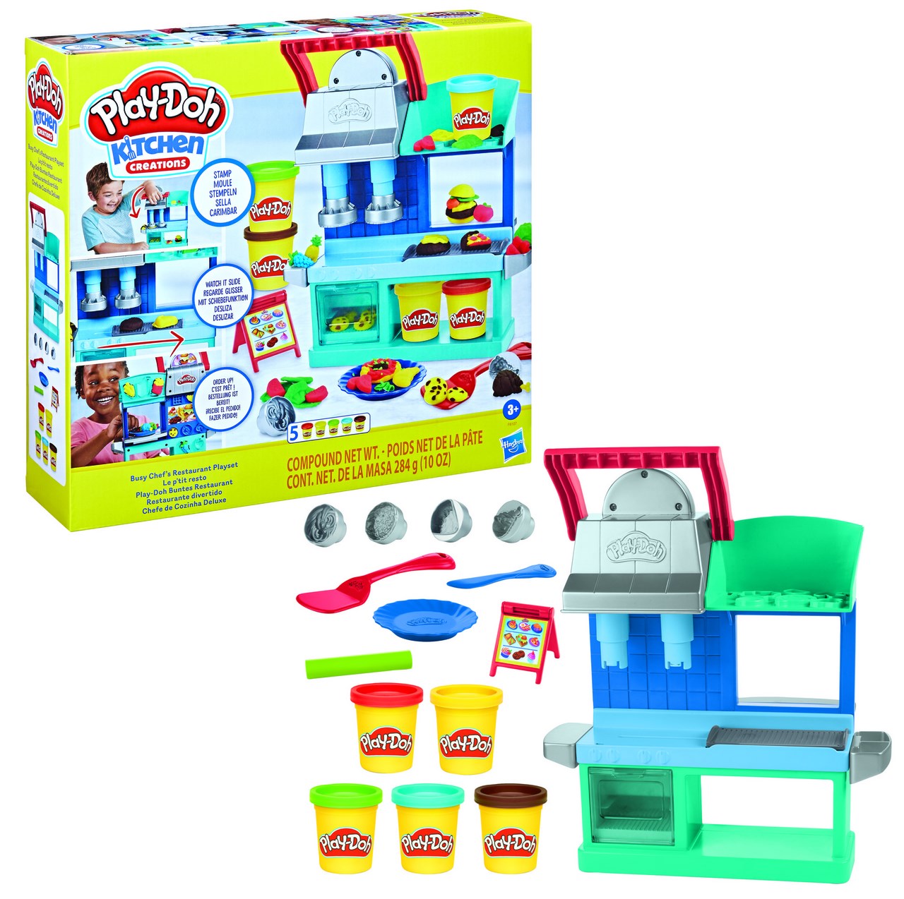 - Díky herní sadě Play-Doh Restaurace zažijí malí šéfkuchaři, jaké je to vést vlastní vyhlášenou restauraci. Přitom budou vytvářet a upravovat úžasné lahůdky, které pak nabídnou svým pomyslným zákazníkům. Děti mohou pomocí razítek vyrobit pizzu, burger, těstoviny nebo kuře – stačí stisknout páčku a na světě jsou hned 2 jídla najednou! Navíc, jakmile se páčka uvolní, budou pak zaujatě sledovat, jak se pečící plech s hotovým jídlem sám posune k výdejnímu okénku. Spousta dalších formiček vás čeká jak