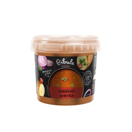 - pitná voda, Cibule Bistro hovězí vývar (pitná voda, hovězí maso a kosti, cibule, mrkev, celer, směs koření, jedlá sůl, slunečnicový olej), brambory 14 %, hovězí maso 11 %, cibule 8,8 %, česnek 3 %, pšeničná mouka, slunečnicový olej, zahuštěný rajčatový protlak, paprika mletá, jedlá sůl, kmín, majoránka 0,1 %, černý pepř 0,02 %, chilli mleté 0,01 %.