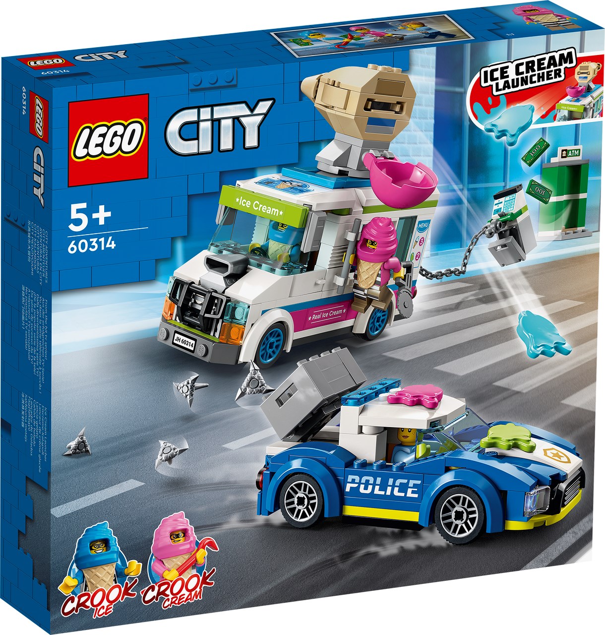 - Se stavebnicí Policejní honička se zmrzlinářským vozem (60314) od LEGO® City si děti mohou přehrávat scény ze seriálu LEGO® City Dobrodružství. Nechybí zmrzlinářský vůz zlodějů se speciálním vystřelovačem, ale ani parádní policejní zásahové vozidlo vybavené pásem na propíchnutí pneumatik. Stačí přidat minifigurky 2 notoricky známých zlodějů a policejního strážníka a děti se mohou na dlouhé hodiny ponořit do světa akčního hraní.