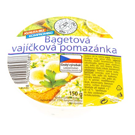 - 60 % VEJCE vařená, majonéza [řepkový olej, pitná voda, vaječné žloutky, modif. bramborový škrob, zahušťovadla (guma guar, xanthan), cukr, jedlá sůl, ocet kvasný lihový], marinovaná cibule (cibule, konzervant SIŘIČITANY), hořčice (pitná voda, HOŘČIČNÉ semínko, ocet kvasný lihový, cukr, jedlá sůl, kurkuma, extrakty koření), cukr, jedlá sůl, petržel, modif. bramborový škrob, konzervanty (benzoan sodný, sorban draselný).