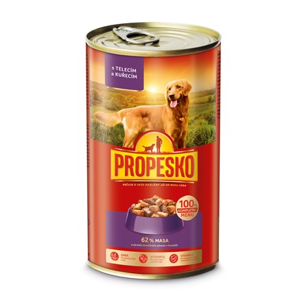 - Propesko Konzerva pro psy telecí, kuřecí 1240 g