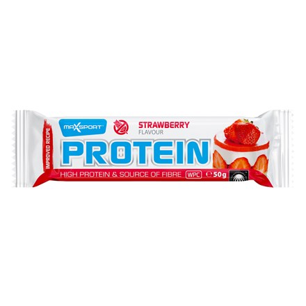 - Proteinová tyčinka s jahodovou příchutí v bílé polevě. S vysokým obsahem bílkovin. Bez lepku.